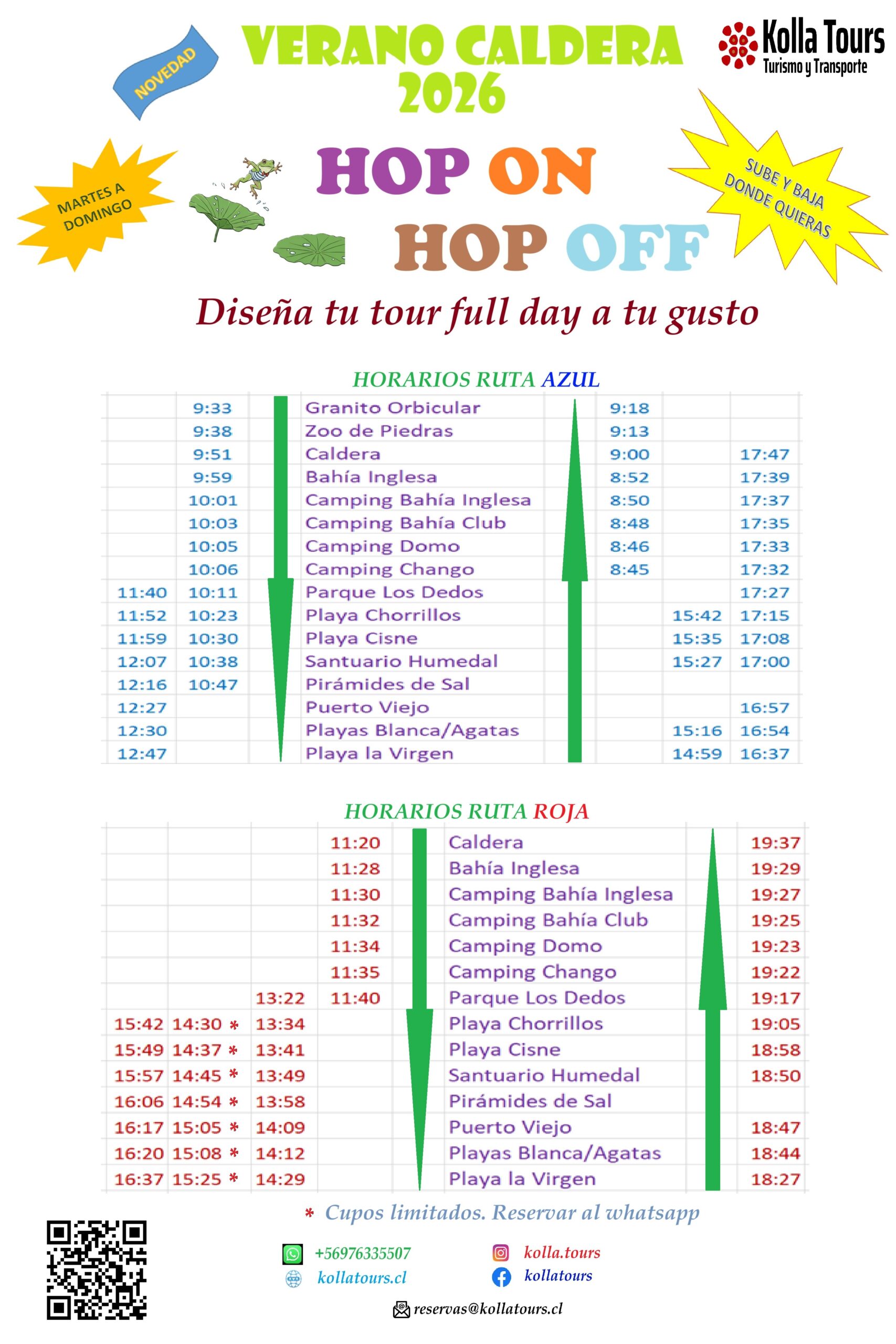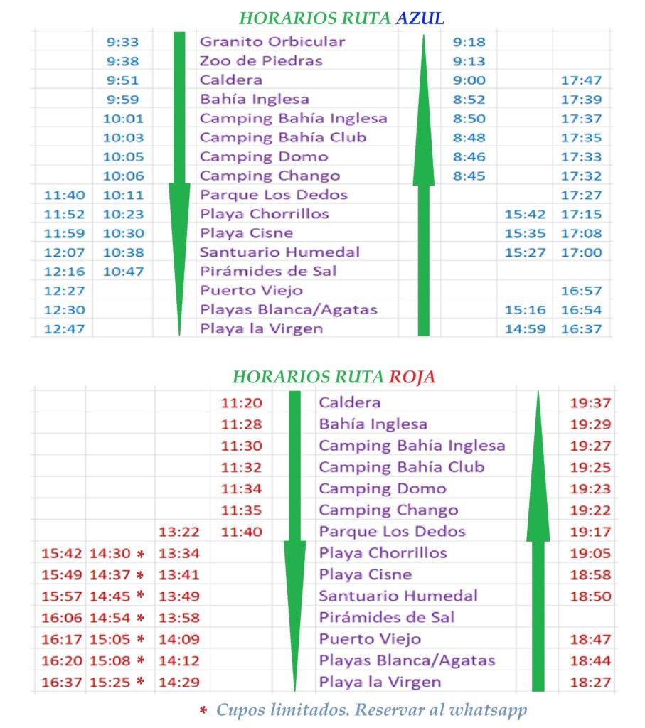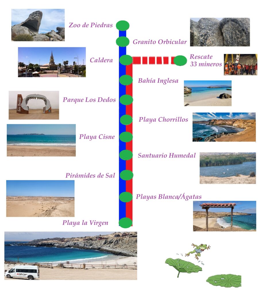 1.- Elije entre las rutas disponibles: AZUL o ROJA. Ambas se ofrecen diariamente pero tienen horarios de paradas distintos. La ruta roja es posible combinarla comenzando con un tour a la mina San José y el rescate de los 33 mineros (costo adicional, ver aquí).